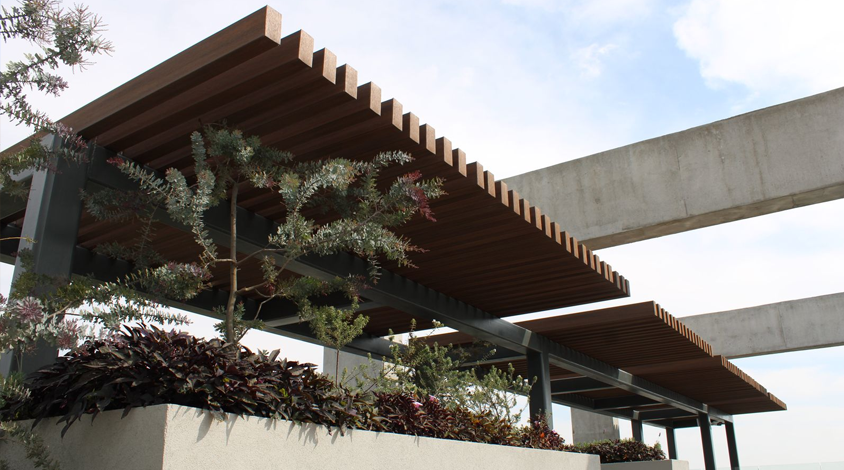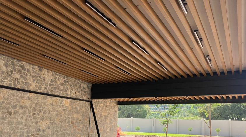 El UH27, viga de gran formato que aporta carácter y calidez a pérgolas o detalles arquitectónicos.