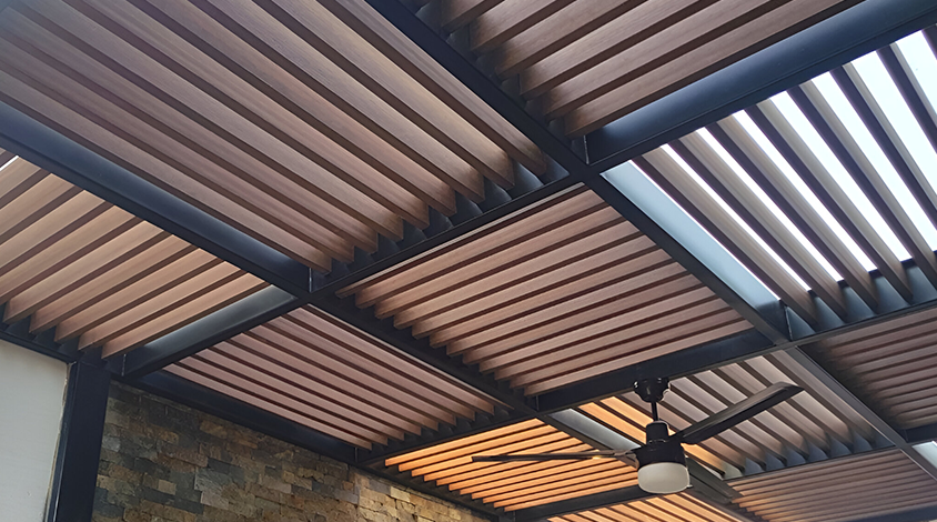 El UH56, viga decorativa que aporta equilibrio y estilo en pérgolas o detalles arquitectónicos. Su acabado natural y la tecnología UltraShield® garantizan color, resistencia y fácil mantenimiento, ofreciendo un diseño moderno y duradero en cualquier proyecto.